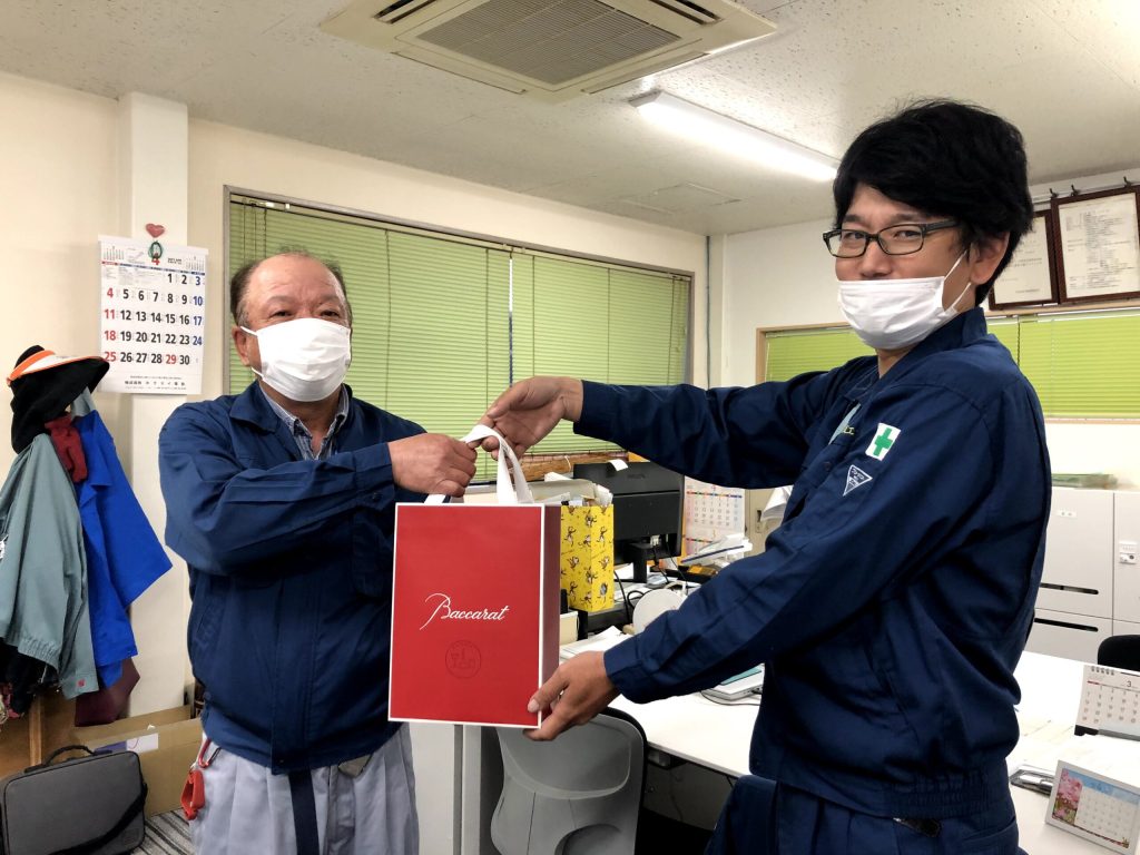 昨年「還暦」を迎えた社員2名に、還暦のお祝いを渡しました。