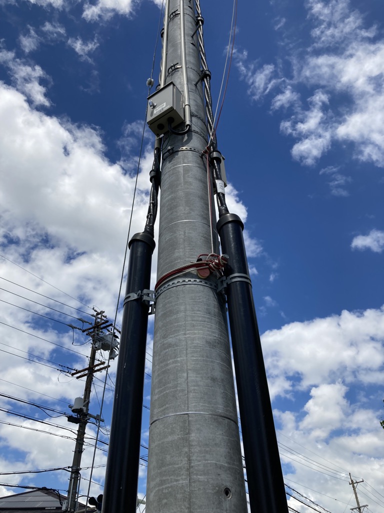 今回、SOGリレーが高い所にあったので、脚立とフルハーネスを使用しての作業でした。慣れない高所での作業だったので、足元に注意しながら作業しました。