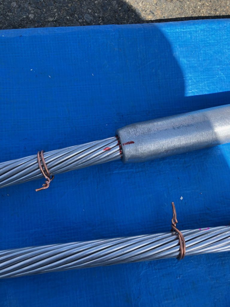 最初に、仮止めして長さを見て、番線で開き止めをして切断しました。切断後、端子に挿して軽く圧縮をして、導電性のグリスを詰めて本圧縮しました。