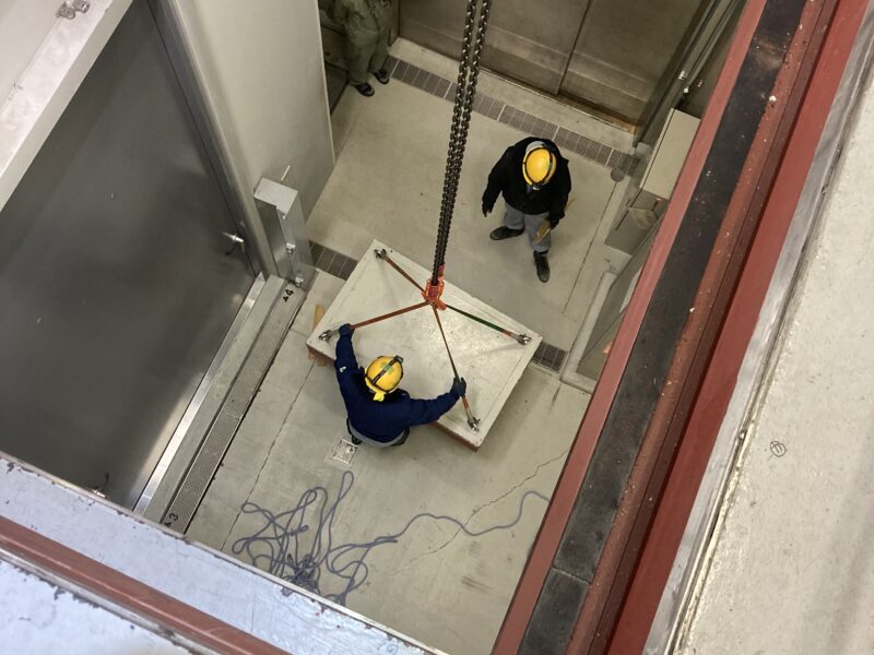 地下変にて点検や工事を行う場合、マシンハッチを開けそこからクレーンにて、