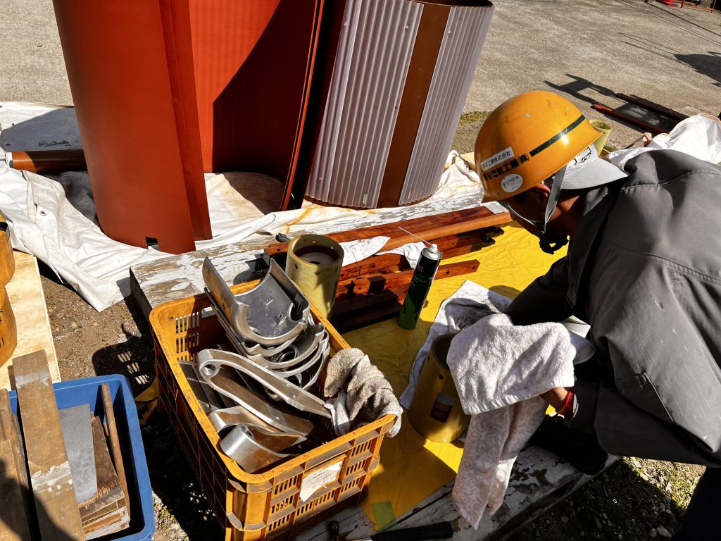 溶剤等を使い、工具には単管パイプを使って力点を強くします。
