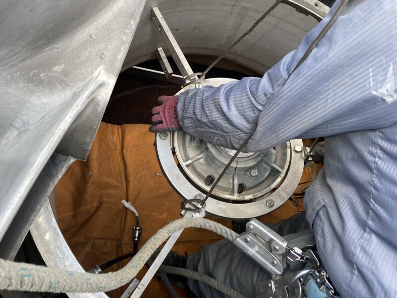 綺麗な冷水にするため、冷却塔の設備の中は少し複雑になっており、ストレーナーや防音材のマットなどがあり、それらを清掃・点検します。